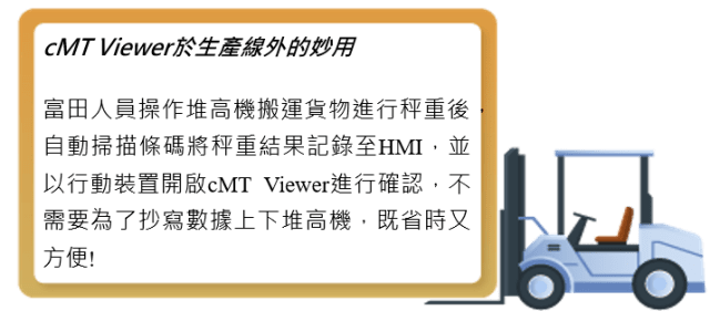 HMI與MES之間的整合不僅僅是設備數據上傳,還需將MES中的資訊反饋至現場HMI。由於MES支援Web服務,富田透過cMT3162X內建的網頁瀏覽器,就能讓現場人員能輕鬆連接至MES,獲取最即時的生產資訊。透過來自MES完整的生產履歷、工單等資訊,現場人員更清楚瞭解當下的生產狀況,並能及時應變,進一步優化產線效率。