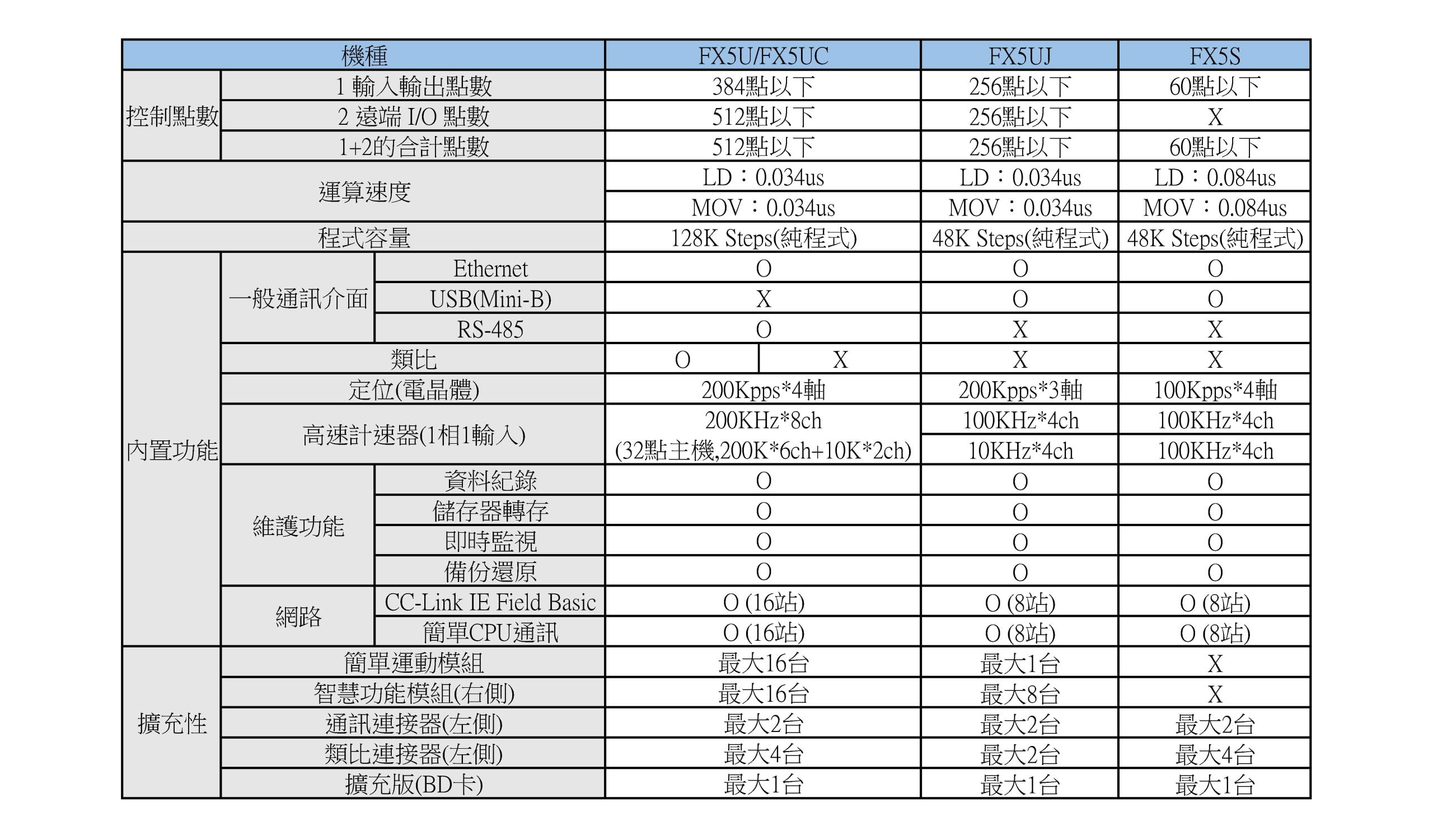 三菱電機iQ-FX5 PLC選型 2023 年 12 月 13 日 最新消息, 產品訊息 Tags: 三菱電機 Mitsubishi PLC 可程式控制器 FX5U FX5UC FX5UJ FX5S 三菱電機的iQ-F系列PLC,有著優秀的性能、充實的內藏功能,以及編輯語言上的多樣選擇等特點,同時也具有多種型號可供選擇,以滿足不同應用的需求。 對於工程師來說,如何選擇iQ-F系列的PLC來使用,包含程式容量、I/O點數等規格要注意之外,我們也列出了幾項iQ-F系列PLC彼此間的差異提供給大家做參考。