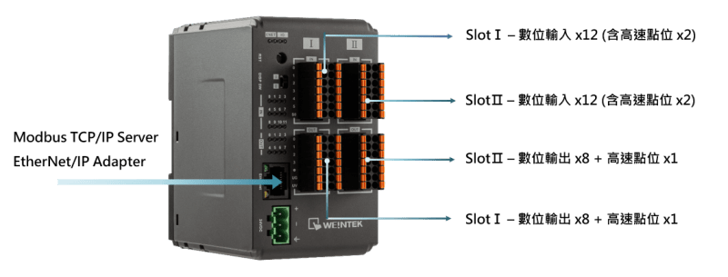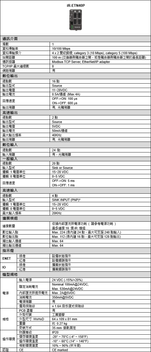 - iR-ETN40P內建MODBUS TCP/IP Server與EtherNet/IP Adapter協議,提供24點數位輸入和16+2點數位輸出。除了內建的I/O外,可擴充式設計允許 iR-ETN40P依需求增加數位、類比I/O、溫度輸入及運動控制模組,提高系統規劃的彈性與靈活性。另外,輸出、輸入點位皆使用可插拔式歐規端子台,讓配線簡單又有效率。